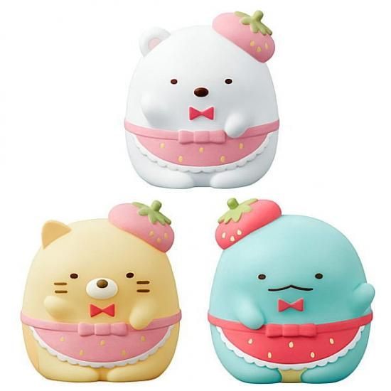 ラインナップは「喫茶すみっコでいちごフェア」テーマのいちご衣装を着たしろくま、ぺんぎん?、とんかつ、ねこ、とかげ、えびふらいのしっぽ、たぴおか、おばけの全8種類。