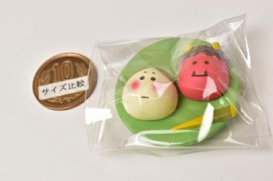 赤鬼とお福、紅白のおめでたいお饅頭。