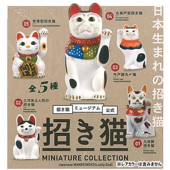 日本最大の招き猫専門博物館「招き猫ミュージアム」が監修し、招き猫のルーツともいえる5種をピックアップした「招き猫ミニチュアコレクション」。土人形、陶磁器製など原形の素材感を、こだわりの塗装で再現しました。招き猫ミュージアム書き下ろしの、招き猫に関する楽しい豆知識・トリビアが満載の解説書付き!
