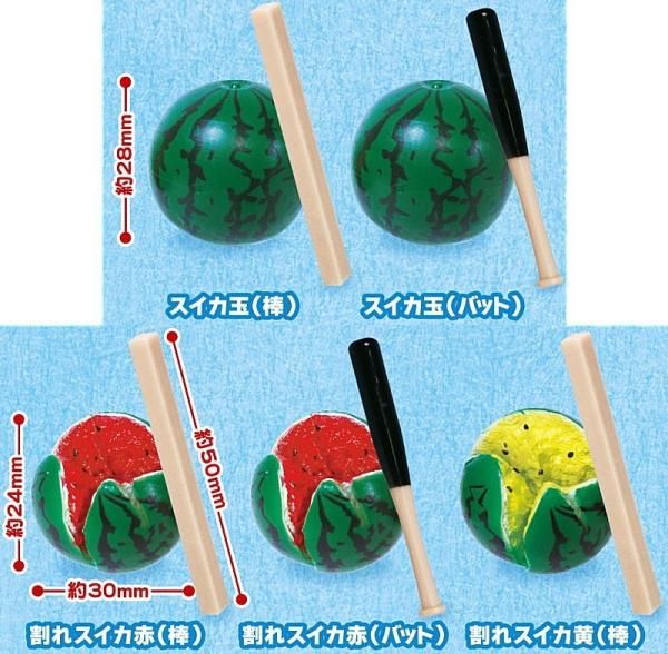 サイズ:約28-30mm(スイカ),全長約50mm(バット,棒)