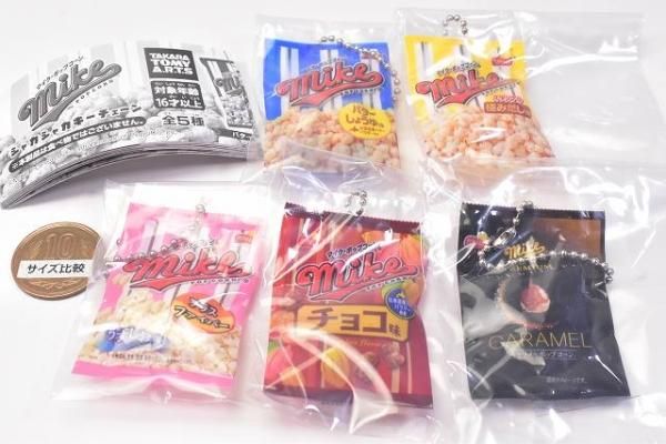 1957年に日本初となる袋入りポップコーンとして発売され、今なお愛されている「マイクポップコーン」がミニチュアキーチェーンとなってガチャに登場。それぞれパッケージが透けていて、中には本物のそっくりのポップコーンが入っています!