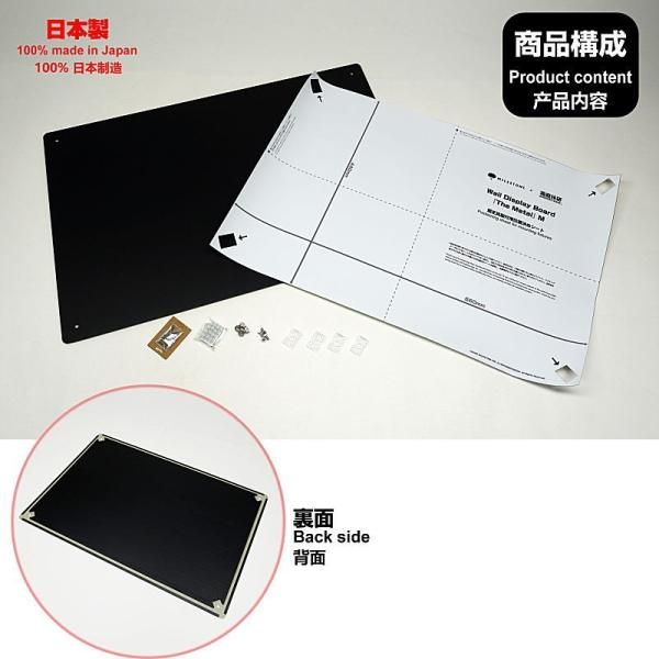 箱庭技研とマイルストンのコラボ商品である、壁掛け設置型のディスプレイ金属板 Wall Display Board『The Metal』Mサイズ。幅660mm×高さ440mmのサイズで、付属の両面テープ付きマグネットを使用してお手持ちの各種カードケース等のコレクションアイテムを磁石で取付け、「自由」で「スマート」なディスプレイが実現可能です。金属板の設置は専用のボード固定具を使用して石こうボードや木製壁面に取り付け可能。壁面への取付には、ボード固定具の取付位置が切り抜かれた付属の位置決めシートを使用することにより、正確な位置決めが可能です。画鋲より細い極細ピンを使用しており、取り外した跡が目立ちませんので、賃貸物件などでも安心してご利用いただけます。また、輪形状のワイヤー等を使用してピクチャーレール等への吊り下げ設置も可能です。金属版背面の中空樹脂製スペーサーの貼付により強度を確保し、重量約1.2kgと軽量化を実現。女性でも手軽に取付が可能です。縦横を逆にして、幅440mm×高さ660mmで使用することも可能。