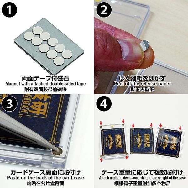 Wall Display Board『The Metal』シリーズに付属している両面テープ付き極薄ネオジム磁石の単体販売商品で、6mm径×0.5mm厚が20枚入りとなっております。お手持ちの各種カードケースのほか、お好みでベースを取り外したアクリルフィギュアなどでもご利用いただけます。展示物の重量に応じて適切な数を貼り付けてご使用ください。貼り付ける際には、貼付箇所を清掃して脱脂してからはく離紙をはがして取り付けてご使用ください。