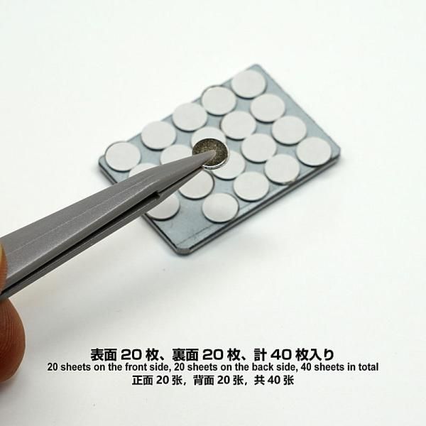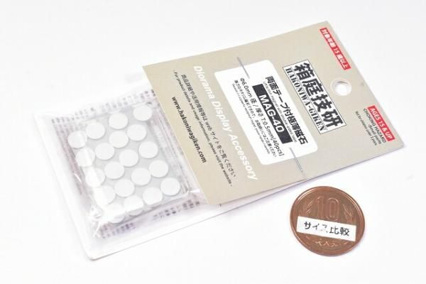 Wall Display Board『The Metal』シリーズに付属している両面テープ付き極薄ネオジム磁石の単体販売商品で、6mm径×0.5mm厚が40枚入りとなっております。お手持ちの各種カードケースのほか、お好みでベースを取り外したアクリルフィギュアなどでもご利用いただけます。展示物の重量に応じて適切な数を貼り付けてご使用ください。貼り付ける際には、貼付箇所を清掃して脱脂してからはく離紙をはがして取り付けてご使用ください。