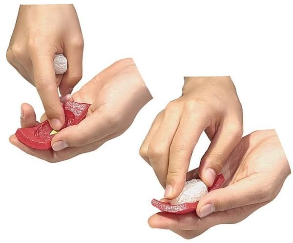 簡単そうで絶妙に難しい!シャリパーツ10個を上手く組み合わせてシャリにして、わさびパーツ・ネタパーツと合わせてまぐろとトロの寿司を完成させます。さらにガリも3パーツのパズル構造になっています。
