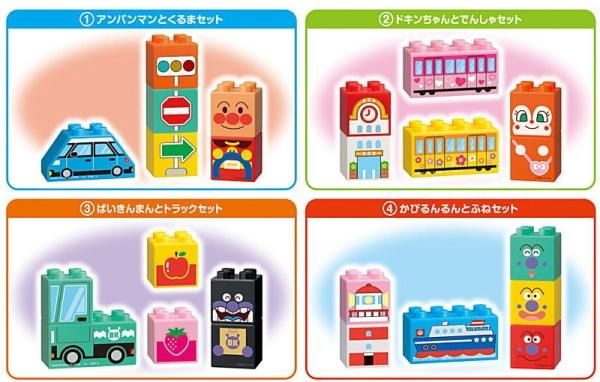アンパンマンと「くるま」セット、ドキンちゃんの「でんしゃ」セット、ばいきんまんと「トラック」セット、かびるんるんと「ふね」セットの全4種をラインナップ☆
