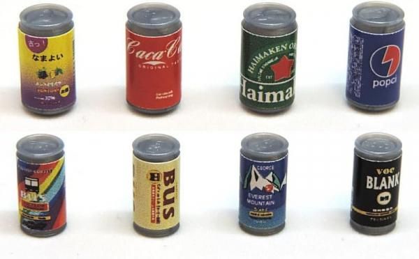 190ml〜500ml前後の飲料缶を1/12に縮小したアクションフィギュア用のミニチュア16本のセットです。